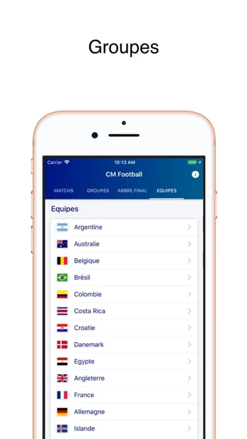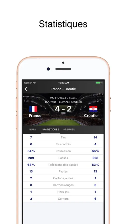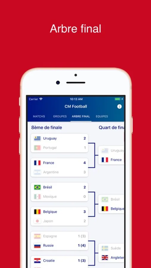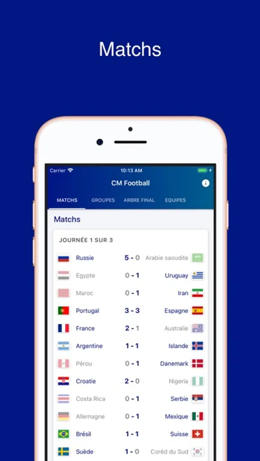 Retrouvez sur l'application "Coupe du monde de Football", les résultats des matchs et leur détails, les groupes, et les compositions d’équipe.