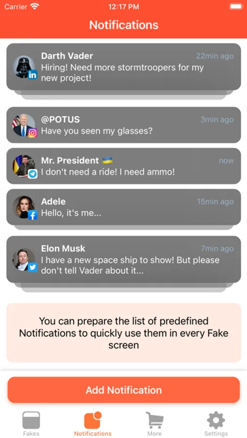• Create more than 3 predefined Fake Notifications;
