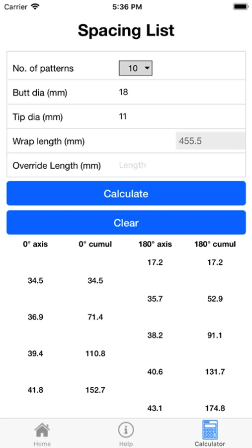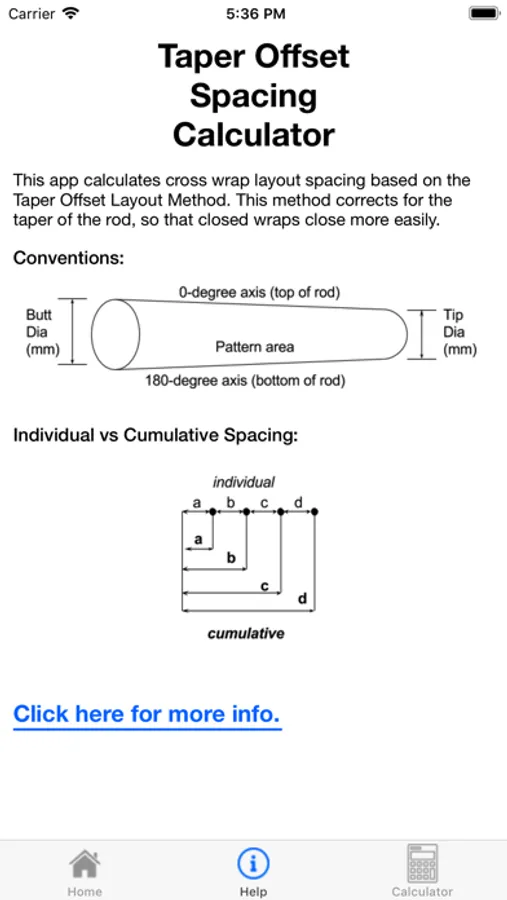 The Taper Offset Spacing Calculator is a tool for custom fishing rod builders who do cross wraps. Enter the size of your rod (butt and tip diameters where the pattern will be wrapped) and the number of pattern repeats, and the app will calculate the spacings or initial crossing points for your pattern.