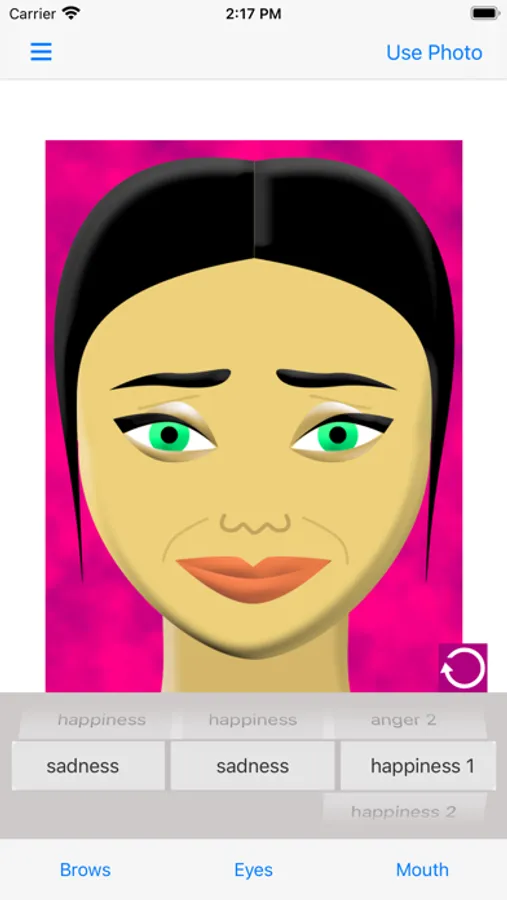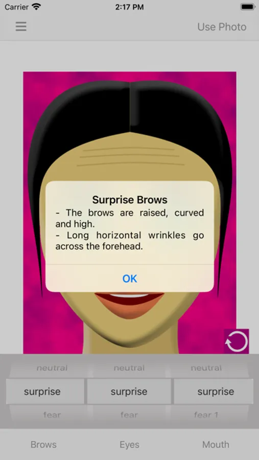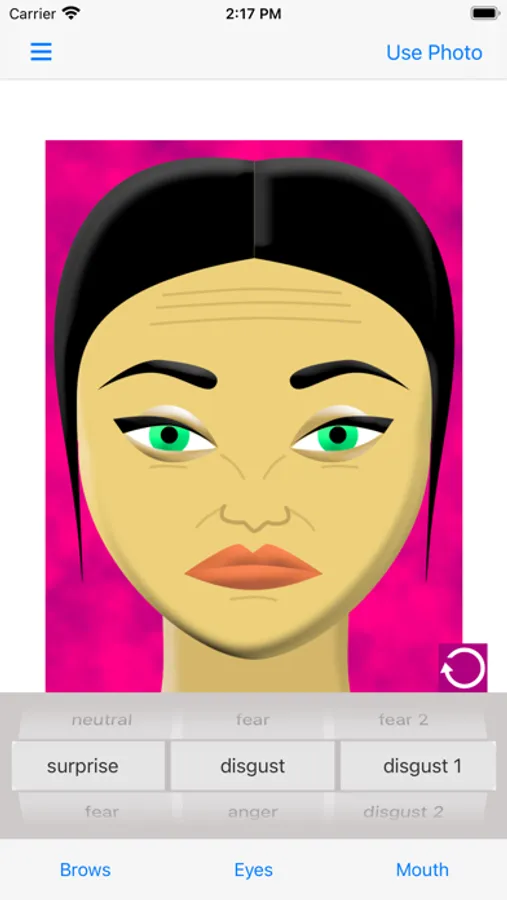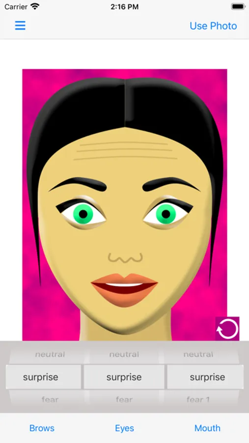 This app allows you to make various combinations of facial expressions. It helps in understanding people's emotions like surprise, fear, disgust, contempt, anger, happiness, or sadness. Each emotion affects the appearance of the brows, the eyes, and the mouth in the face. In order to know what happens exactly to each part of the face, tap the corresponding button at the bottom of the screen.