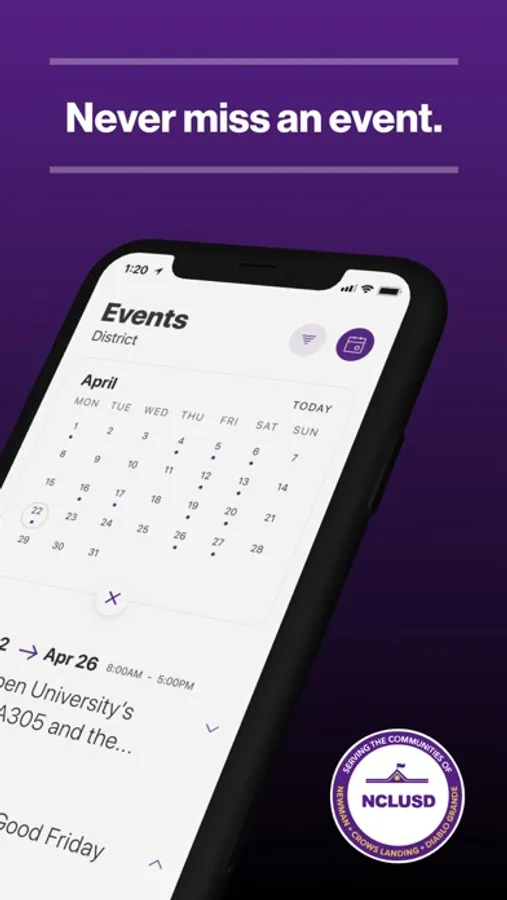 The event section shows a list of events throughout the district. Users can add an event to their calendar to share the event with friends and family with one tap.