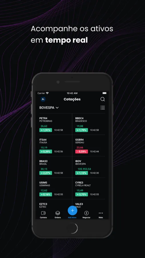 Baixe o aplicativo, faça o teste gratuito e experimente como é ter a Bolsa de Valores na palma de sua mão!