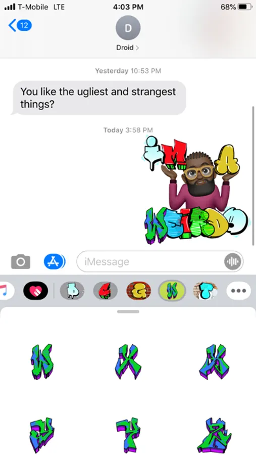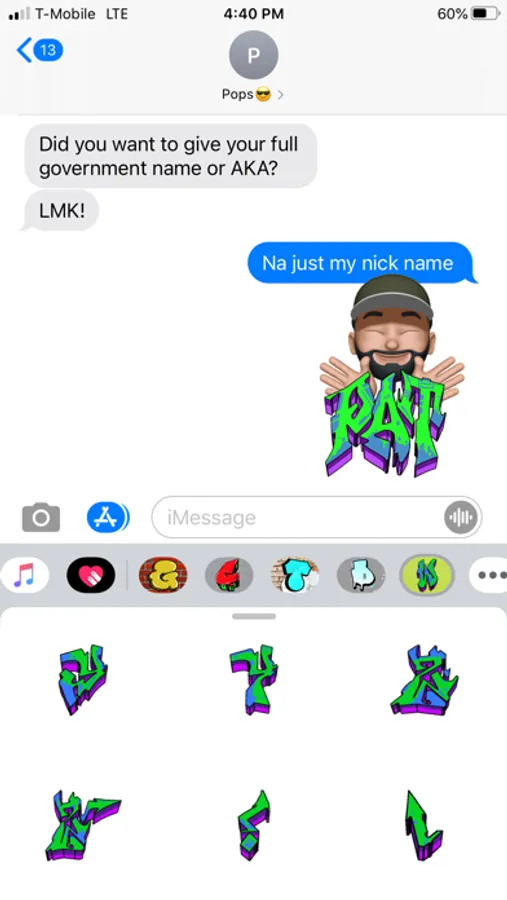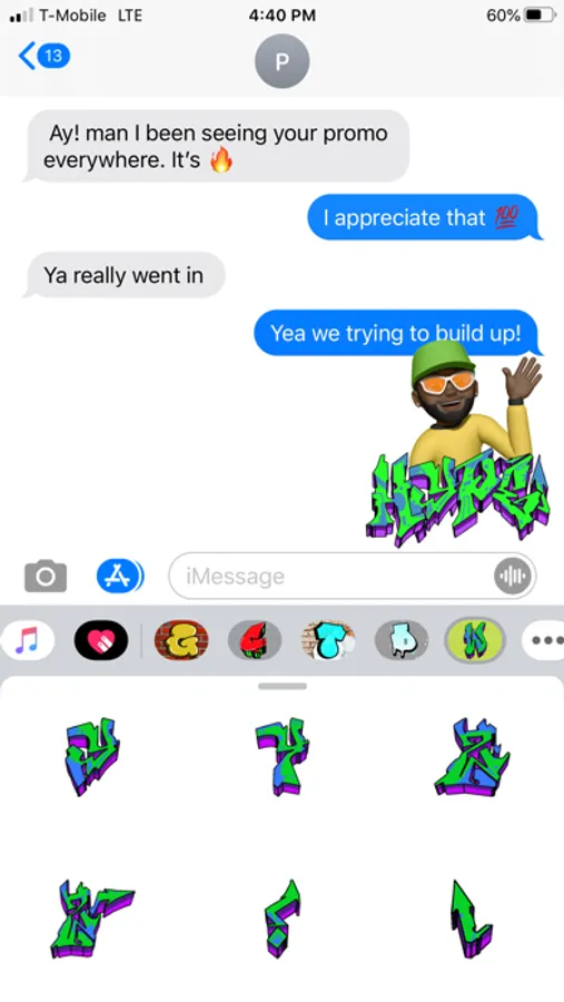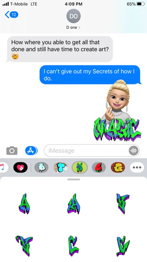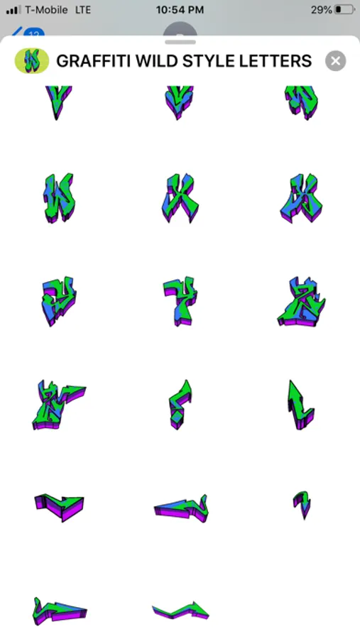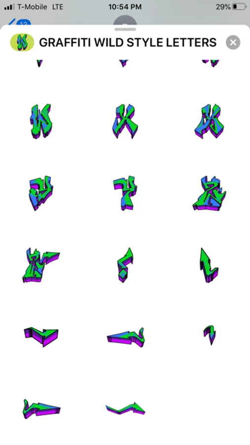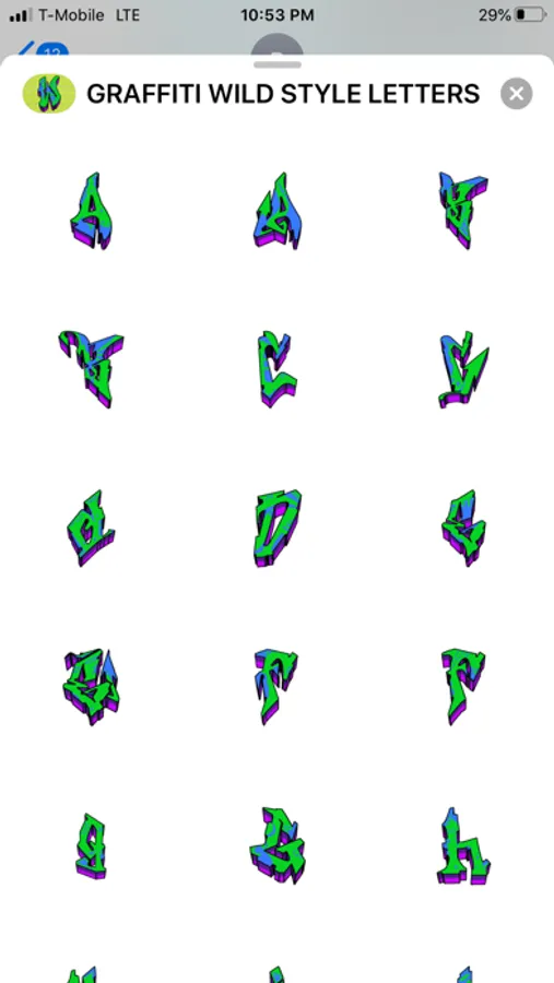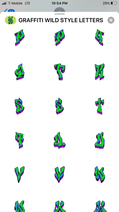 THIS GRAFFITI WILD STYLE STICKER PACK COMES WITH UPPER, LOWER CASE LETTER & ARROWS. USE THEM IN iMESSENGER TO MAKE ANY WORD, TITLE YOUR IMAGES OR TO ADD GRAFFITI STYLE TO YOUR MEMOJI.