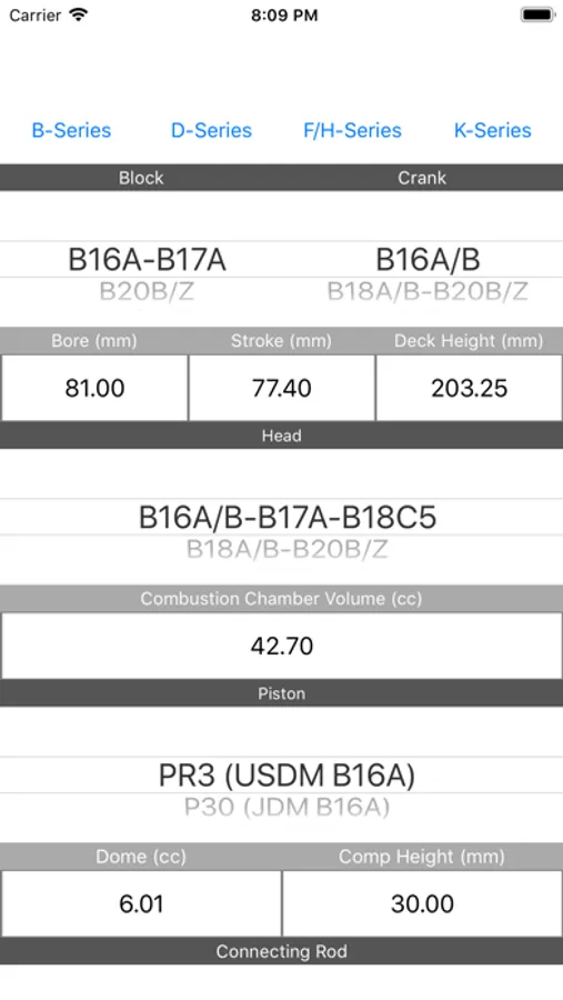 Engine Compression Calculator which contains B-, D-, H/F- and K-Series Honda™ Engine parameters.
