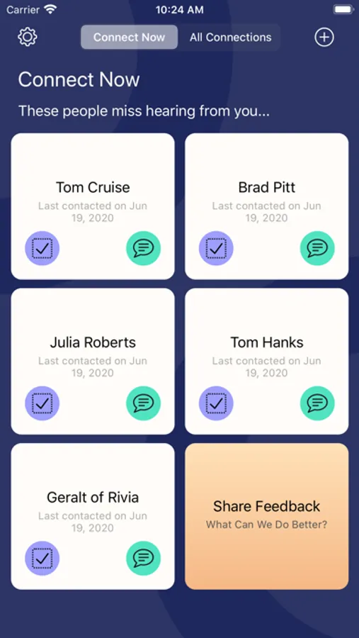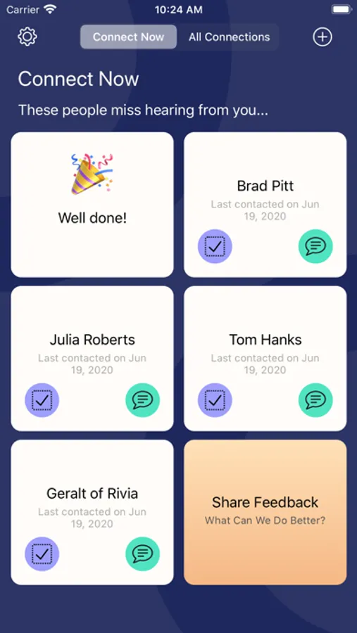 Each day, use your dashboard to reach the zen in your social life. Up to 6 of your “due” connections will display here. Once you contact all 6, be at peace and leave the app in order to go do the things you love!