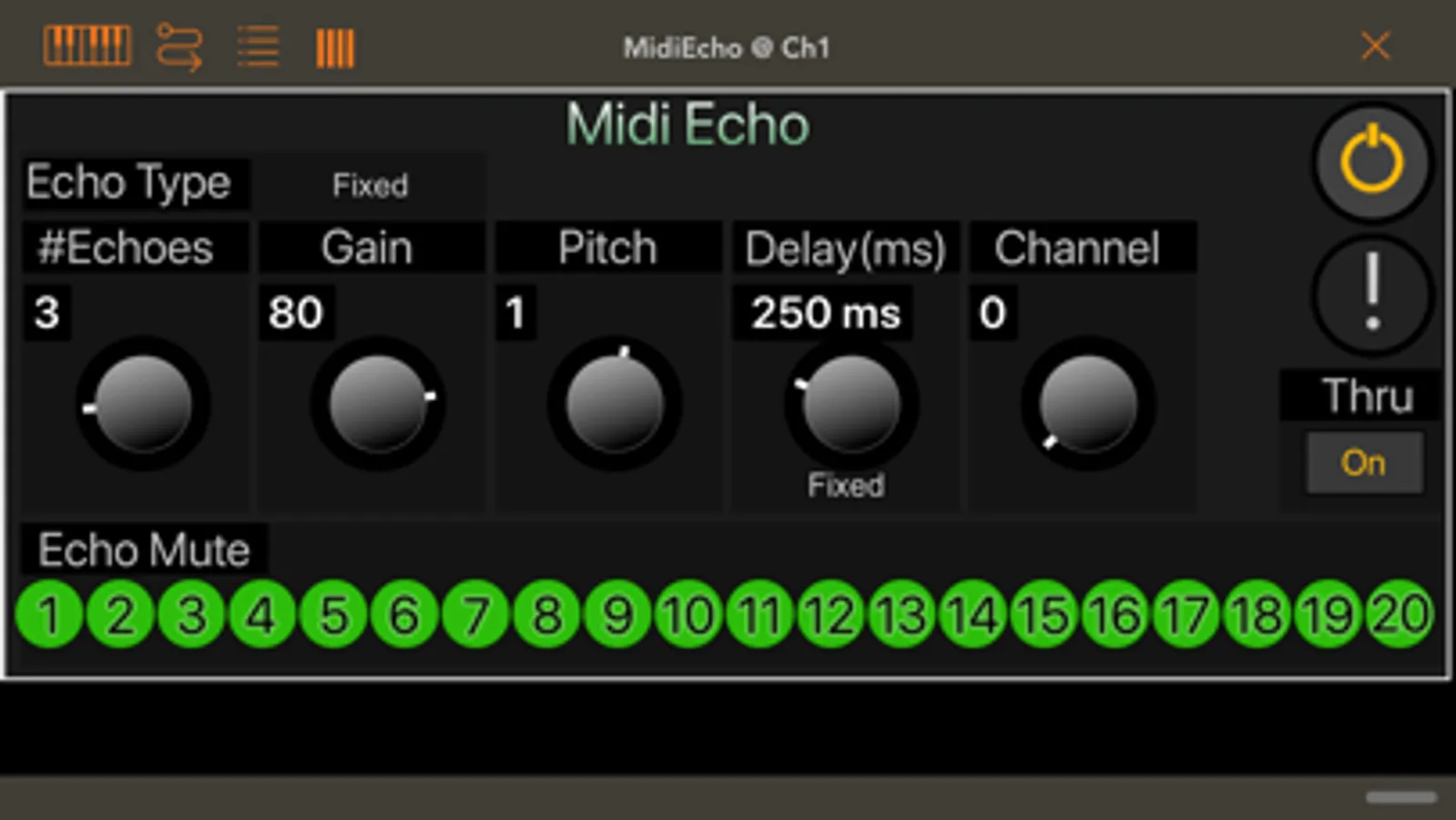 So what is a midi echo? It is similar to the audio echo effect where copies of the original audio are repeated at regular time intervals but with some form of change (e.g. quieter). But unlike audio, midi is digital in nature (low resolution 8 bit mostly) and focused around the midi note on & off message used to control synths etc.