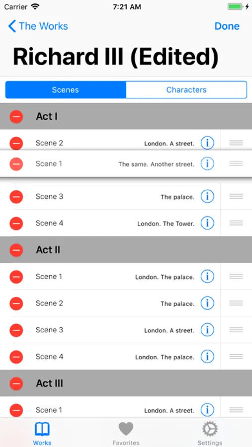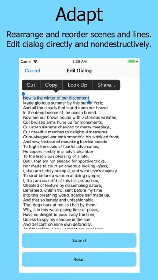 Chances are that your Shakespeare performance is an abridged version of the original. If you’re directing, the app makes it easy to create your own adaptation. With a swipe, delete or reorder entire acts or lines of dialog. Fine tune your edits by directly editing the dialog text.
