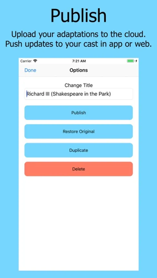 If you’re a director or dramaturge, you can distribute your adaptation to your entire cast or audience. An in-app purchase will allow you to upload your work to the cloud so that your cast can install it in their own apps by using a unique five-letter access code. Memorization and navigation features will work for your adaptation just like any other script in the app. If you make further changes to the script, your subscribers’ scripts will update automatically. Your script will also be available at TheShakespeareApp.com for any cast member to access with your code.