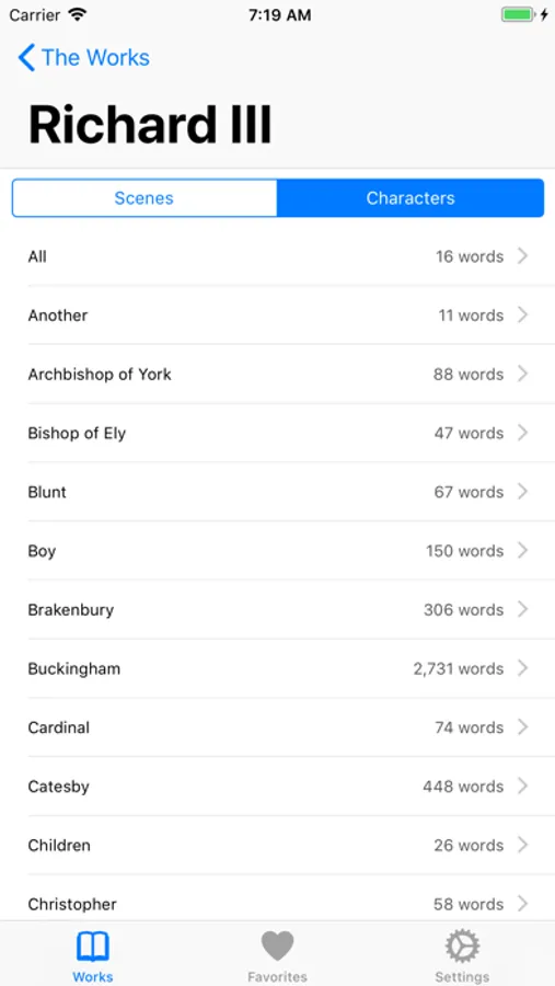 Start reading from Act 1 Scene 1, or navigate to particular scenes with a couple of taps. A list of characters will show you how many words each part is assigned, then you can view only that character’s lines with short cue lines to give you context and prompts.