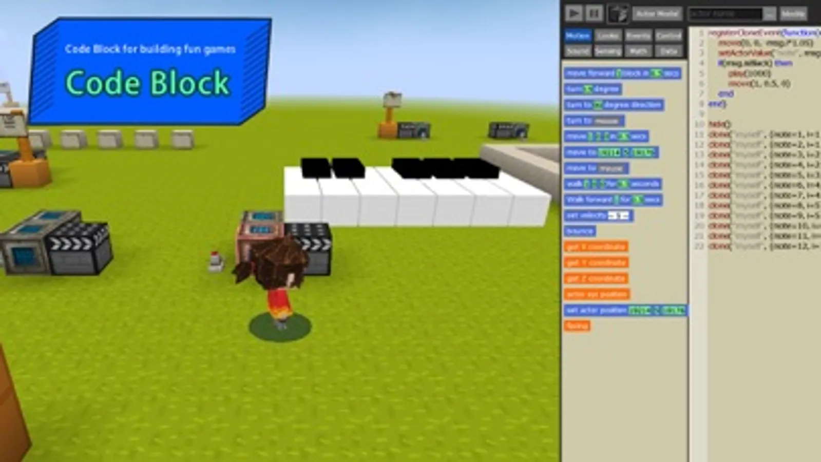 Learn making fun games with Code Block, for example, Jump & Jump, Play Piano, Whac-A-Mole.