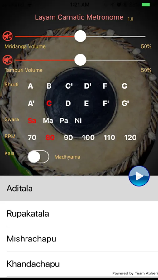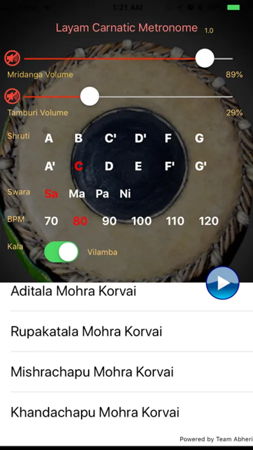 "Layam - Carnatic Metronome" App is a new concept which helps students to practice with Mridangam anywhere, anytime through this app with real Mridangam tones. This app sharpens the Rhythmic skills of every student when practiced in right way. Please watch our demo videos in YouTube for usage guidelines.