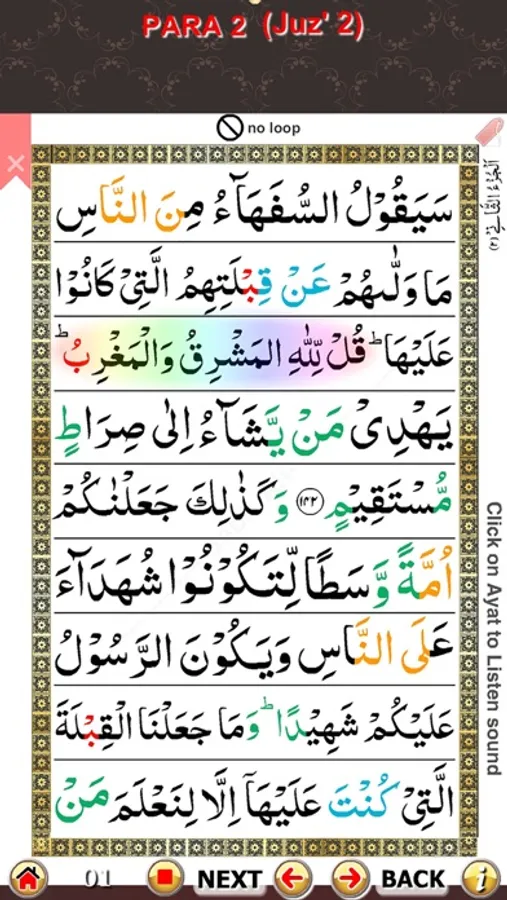 The Holy Quran is divided into 30 equals parts also known as Thirty PARA. In this application part 2 which is also known as Sayaqool PARA is presented with Sound of Abdullah Sharif. It is Para 2 of the Holy Quran (Qur'an) 9 Lines Black / Color Coded Tajweed.