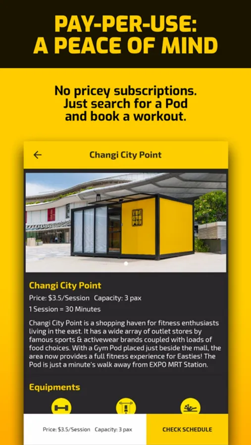 Welcome to #TheGymPod, a fully automated private gym that you can book on a 24/7 basis. We don’t believe in outrageously expensive gym memberships, crowded gyms, or waiting for equipment.