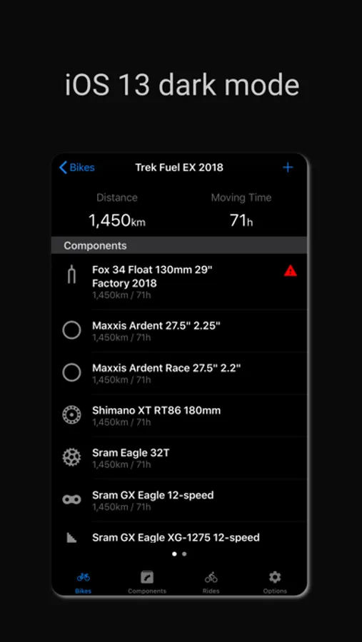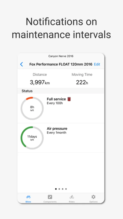 * Receive timely notifications for component maintenance or replacement. For example, when your MTB suspension fork hits 120 hours of use, your road bike waxed chain clocks 400 km, or your gravel tires reach 5000 km.