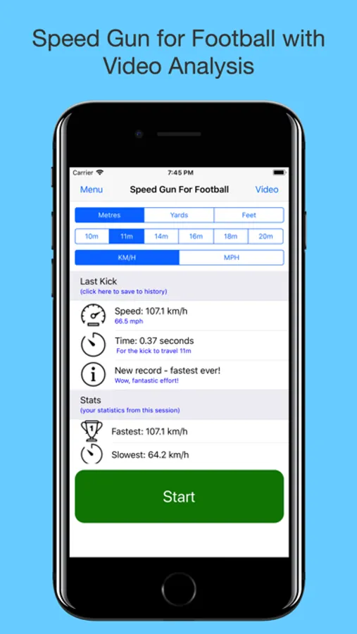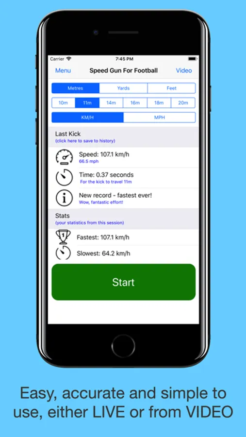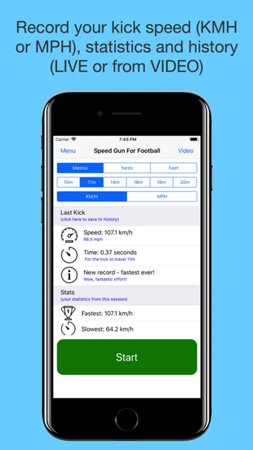 Calculates and stores speed, time, fastest kick, slowest kick and average speed. Customisable kick length and display in either MPH or KM/H.