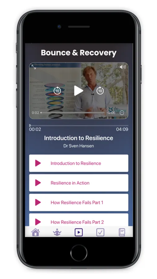 Inside the Resilience App you will find the Resilience Diagnostic assessment, a goal tracker, meditations and resilience training videos. Our objective is to help you bounce, grow, connect and flow. The content inside is evidence-based, practical and integral.