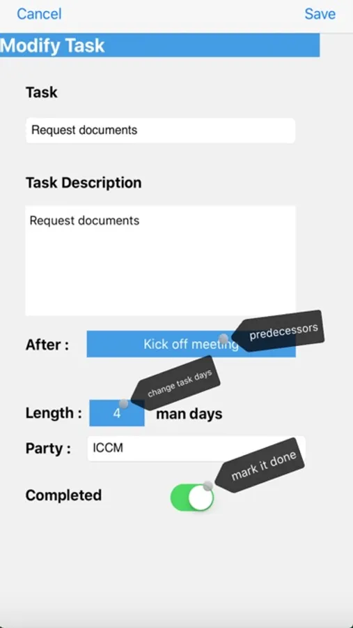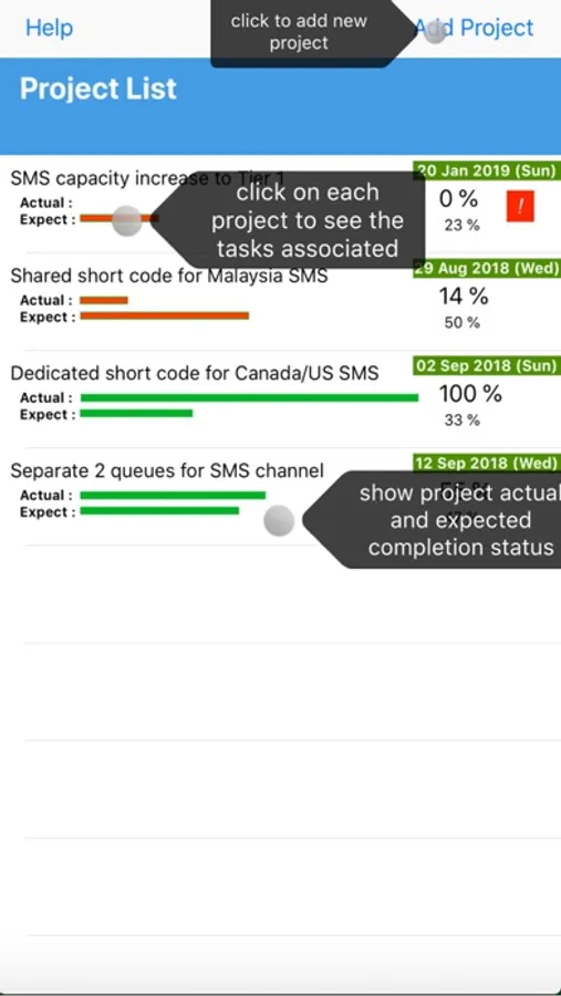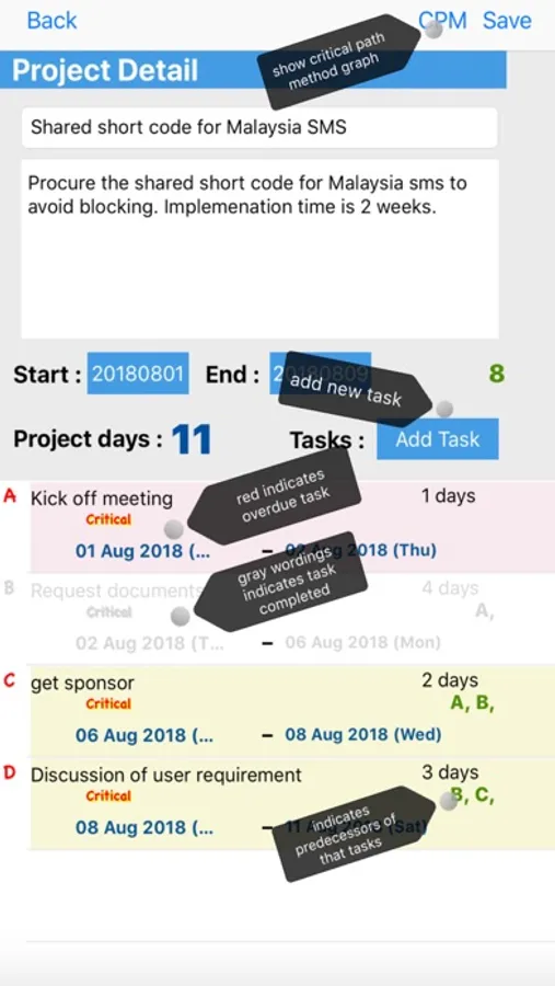 This app is a project management tool for setting up tasks for various projects. You can define the sequence and length of tasks which will auto provide you a graph by critical path method. Moreover it provides indicators for overdue tasks for each project.