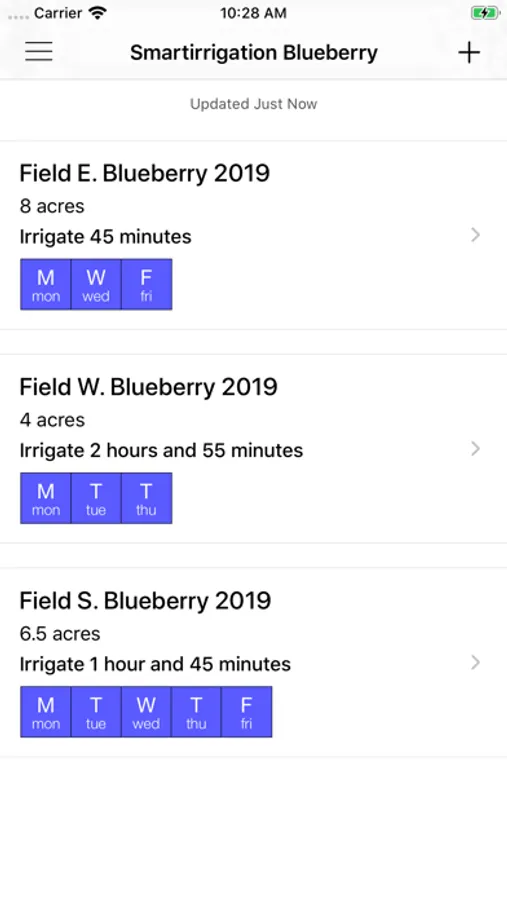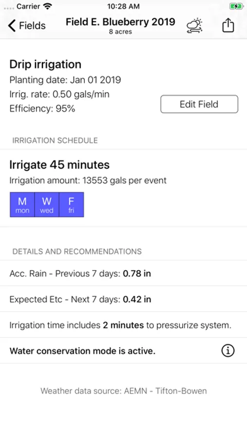 This App was developed to give blueberry growers a smartphone accessible program to irrigate newly established to mature blueberry plantings. The irrigation calculations recommend irrigation rates based on evapotranspiration, precipitation, soil type, and drip irrigation system rate.
