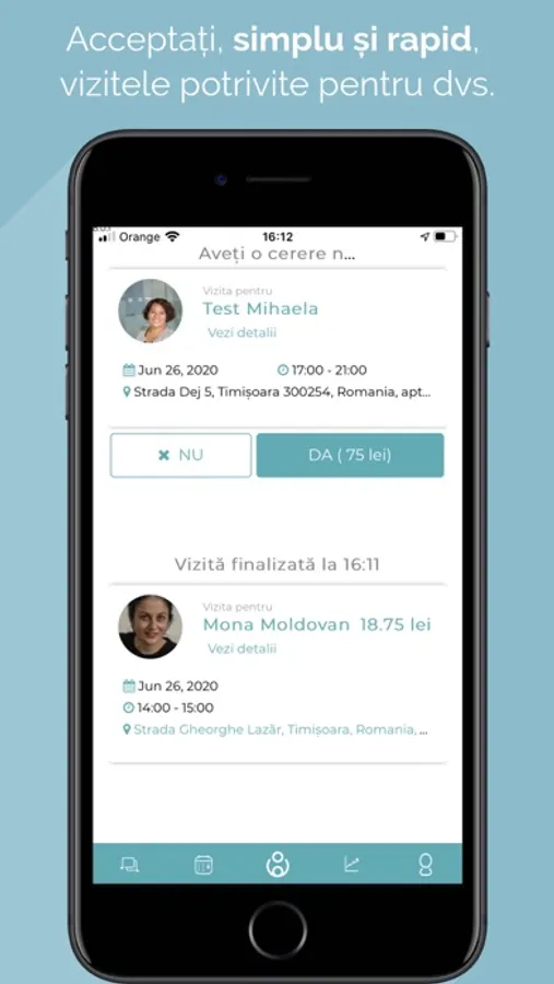 Folosiți aplicația The Care Hub pentru a accepta simplu și rapid vizitele potrivite pentru dvs. Urmăriți cererile primite și detaliile aferente (data, interval orar, adresa, serviciile solicitate, informații despre beneficiarul serviciilor etc.) și acceptați acele vizite care se potrivesc cu preferințele dvs., iar de restu ne ocupăm noi.