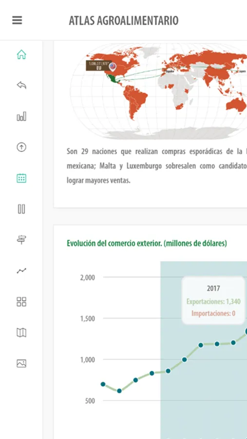 Esta app ofrece un pronto acceso a información de la producción agroalimentaria (agricultura, ganadería y pesca) de México, facilitando la consulta de datos de sus 72 productos más relevantes: desde su evolución en la producción nacional, pasando por las exportaciones e importaciones, hasta las características geográficas adecuadas para su producción.