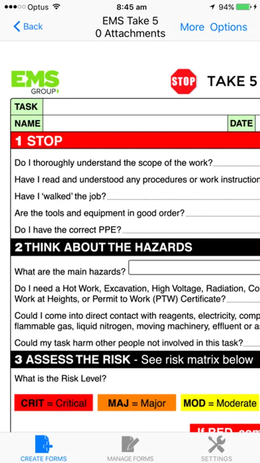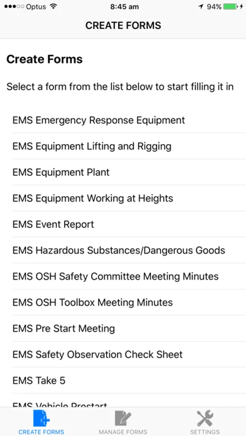 The EMS Safety application allows users of the EMS SafeX Safety Management System to submit forms directly from their mobile device. Forms can be completed off-line and sent through once a network connection is available.