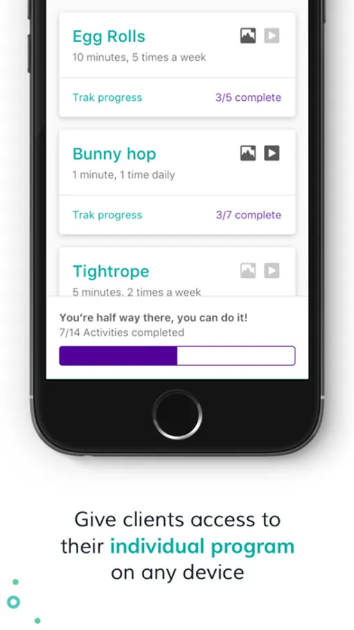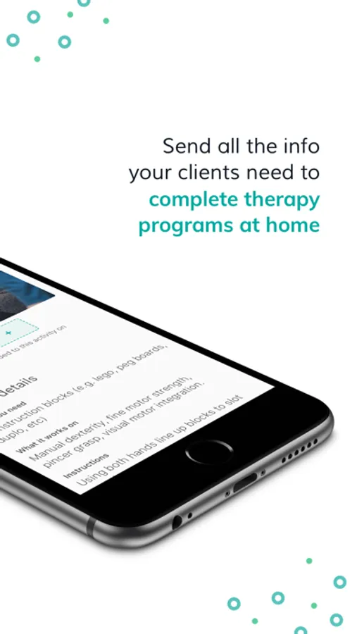 Therapists have access to a database of therapeutic activity scaffolds which they can easily access within a therapy session. Therapists then attach photos and videos to create highly personal home programs, individual to each client’s needs. This allows the therapist to grade the activities to the child’s abilities and give specific verbal and written notes about task completion.