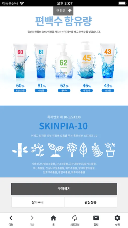 편백수 60% 로션&크림, 편백수 81% 수딩젤, 편백수 62% 거품 물비누, 편백수 45% 바디&샴푸 ,편백수 43% 약산성 썬 케어크림,
