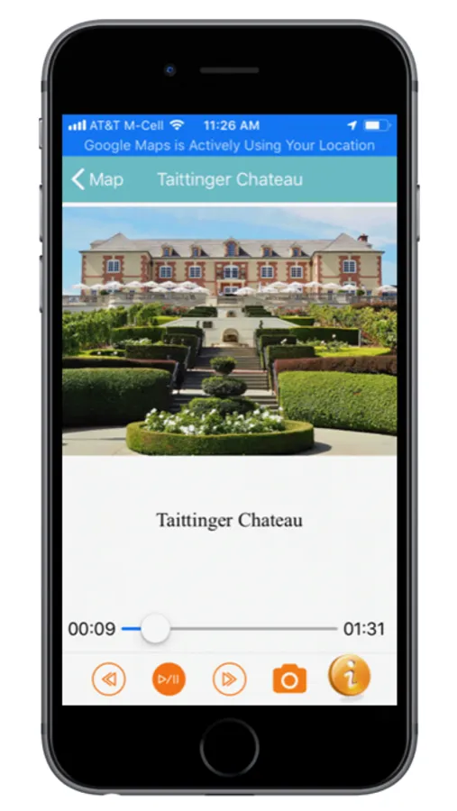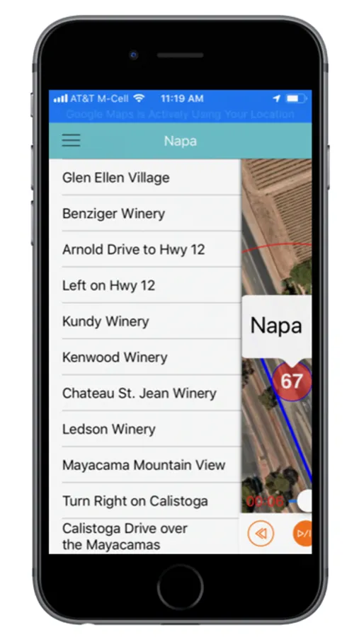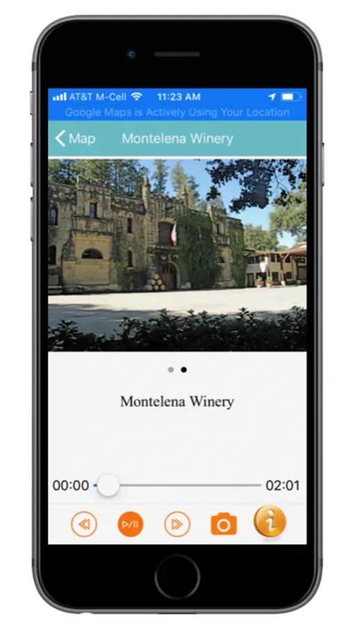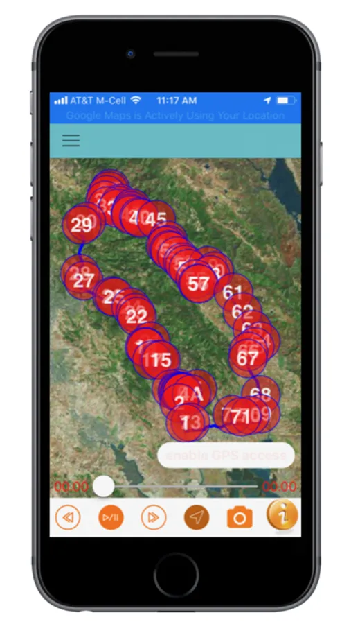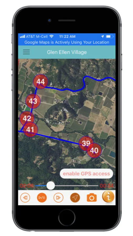 The narration and driving directions are activated by GPS locations and spoken to you as you move through the tour route to assist you while driving. If you want to replay any description or direction just tap that position on the map. You must allow your device to “access you location” when using this GPS tour. If not connected, tap the notice in the lower right corner of you screen.