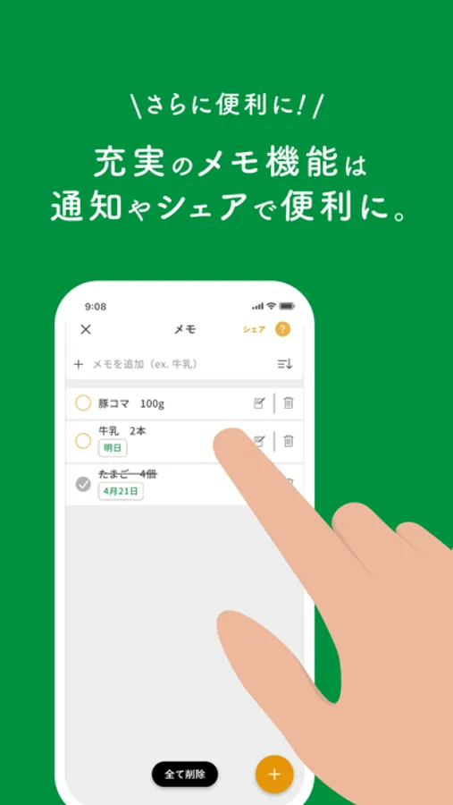 買いたいものをすぐにメモへ登録しておけば、買い忘れの心配がありません!