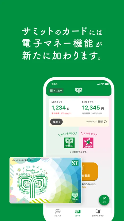 アプリでラクラク、サミットカードにご入会!既にプラスチックカードをお持ちの方は、連携も可能です。アプリをポイントカードとしてご利用いただけますのでカードを忘れて残念な気持ちになる事はもうありません!貯まっているポイントや利用履歴もわかります。