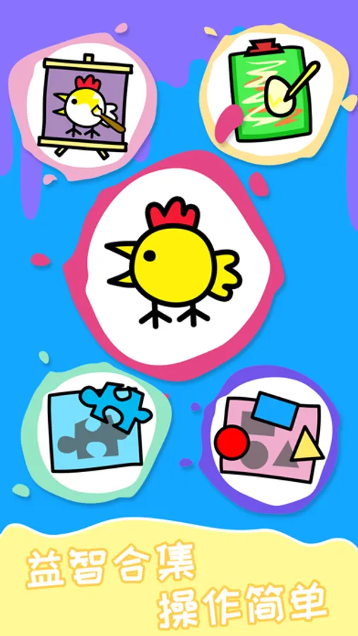 快乐小鸡是一款面向6岁以下儿童的画画益智游戏,专门设计针对小朋友的学习兴趣和方案来设计的一款游戏。游戏中收录了许多可爱小鸡的图案、画画、拼图和形状等方案,让小朋友自己选择喜欢的一种来进行学习和深入研究,从而提高小朋友的学习乐趣和动力。我们不仅体现儿童画画教育,亲子互动教育,智力开发绘图。而且游戏内容易学易懂,通过这种方式自编教材,化繁为简,深入浅出。借用直观的实战练习让小朋友直接获取知识,快捷、方便、实用。是儿童初学者的最好帮手。可以有效促进儿童对绘图和动物的喜爱,启发儿童的想象力、记忆力、创造力。