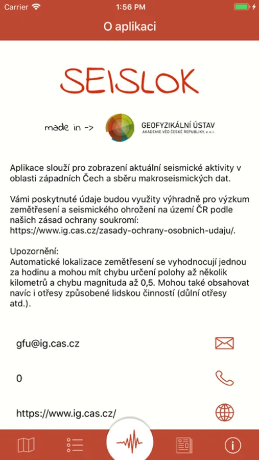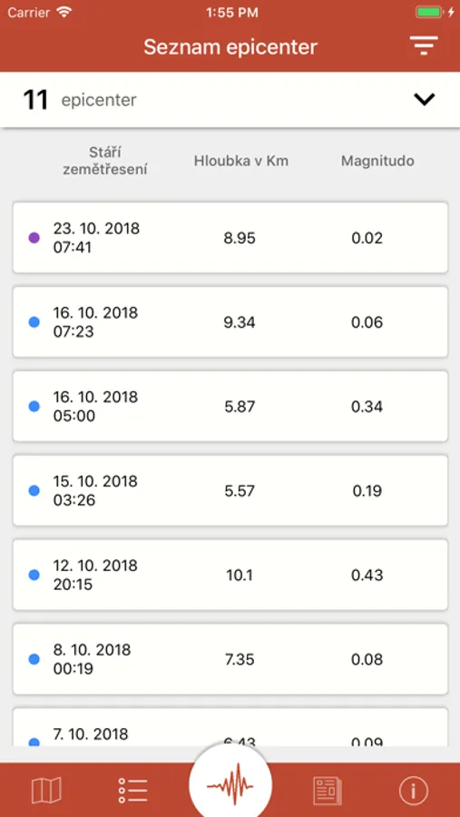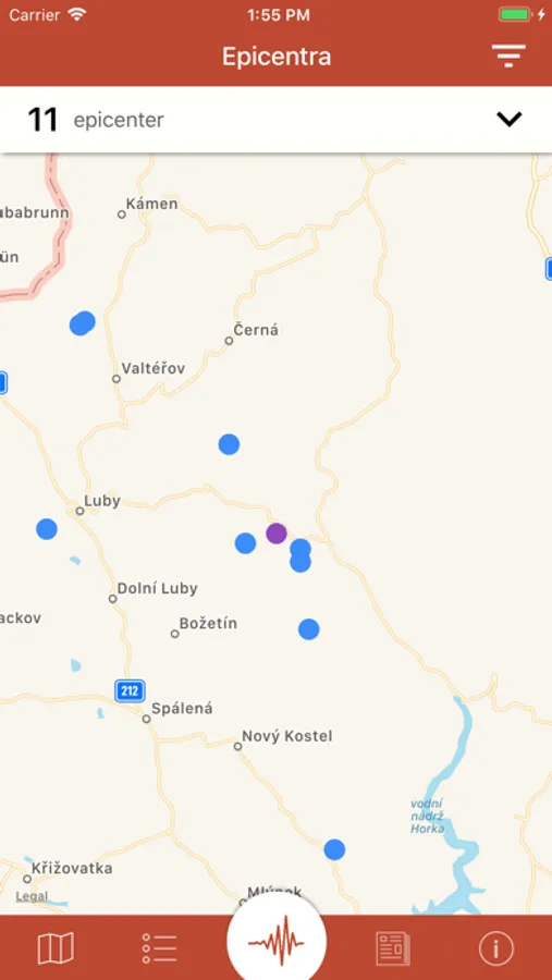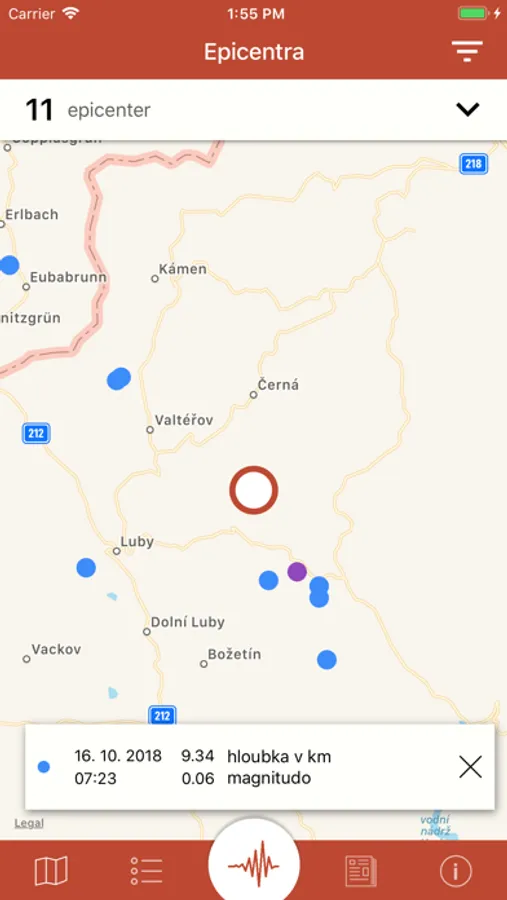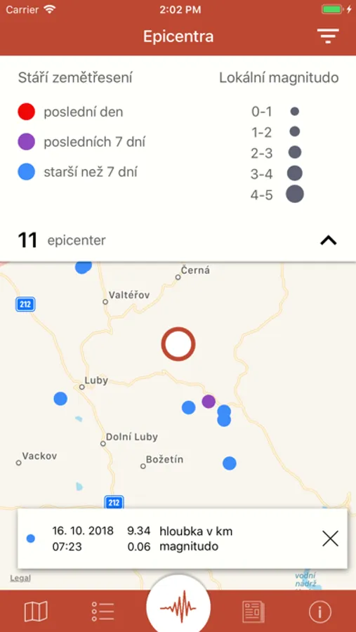 - podívejte se na mapu s polohami epicenter, klepnutím na puntík zobrazíte detailní informace (magnitudo, čas vzniku, hloubku)