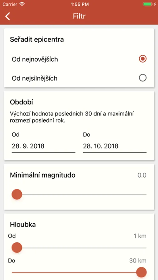 - prohlížejte seznam zemětřesení (s možností filtrovat a třídit)