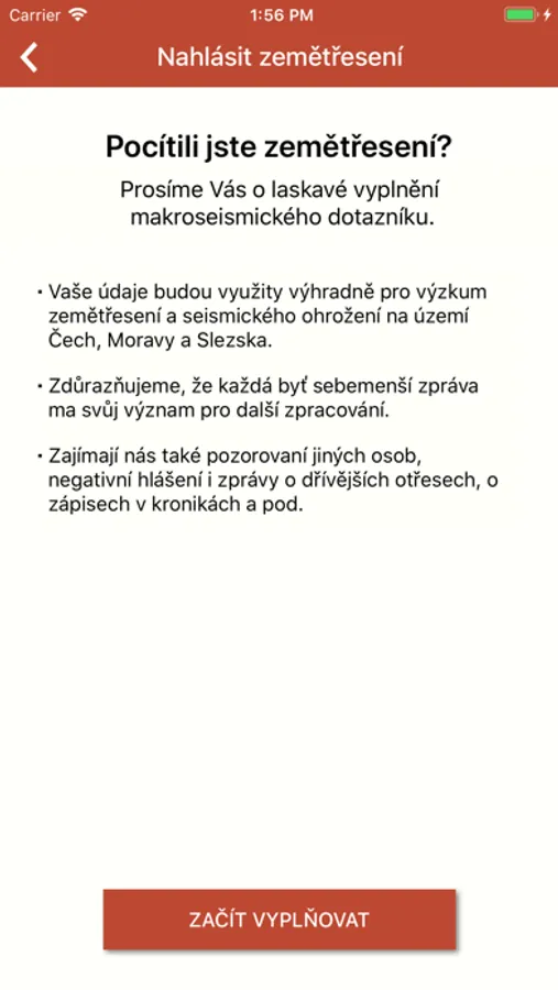 - stiskněte tlačítko se symbolem seismogramu a nahlašte zemětřesení