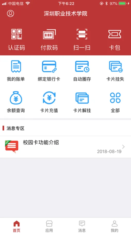 提供全面的校园卡服务,充值、信息查询、账单查询、流水查询、挂失/解挂、失卡招领、校园卡在线申请、校友注册等