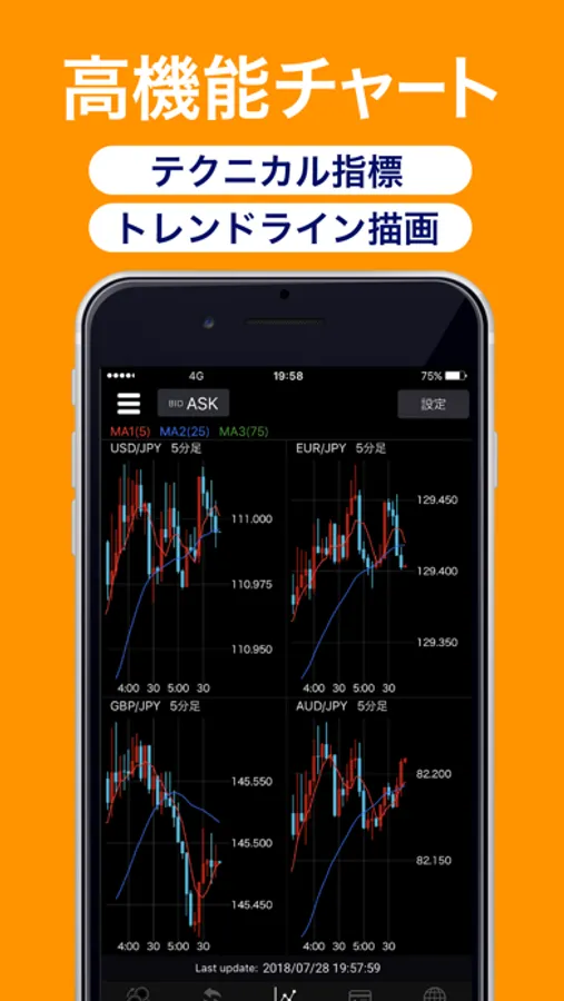 TICKから月足まで11種類の足種を選択でき、また移動平均やMACD等、