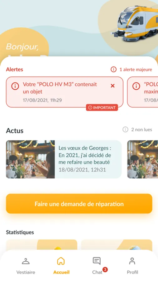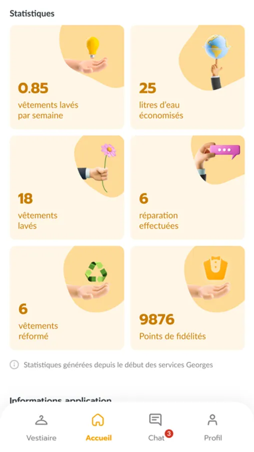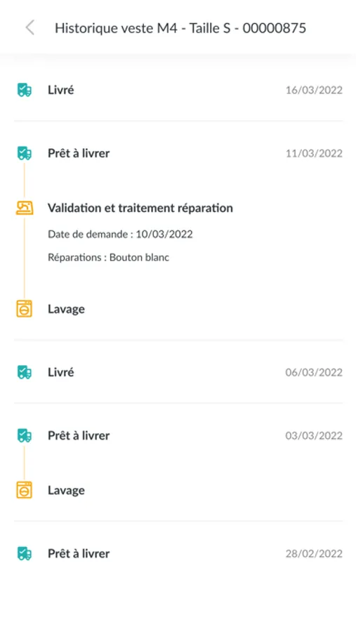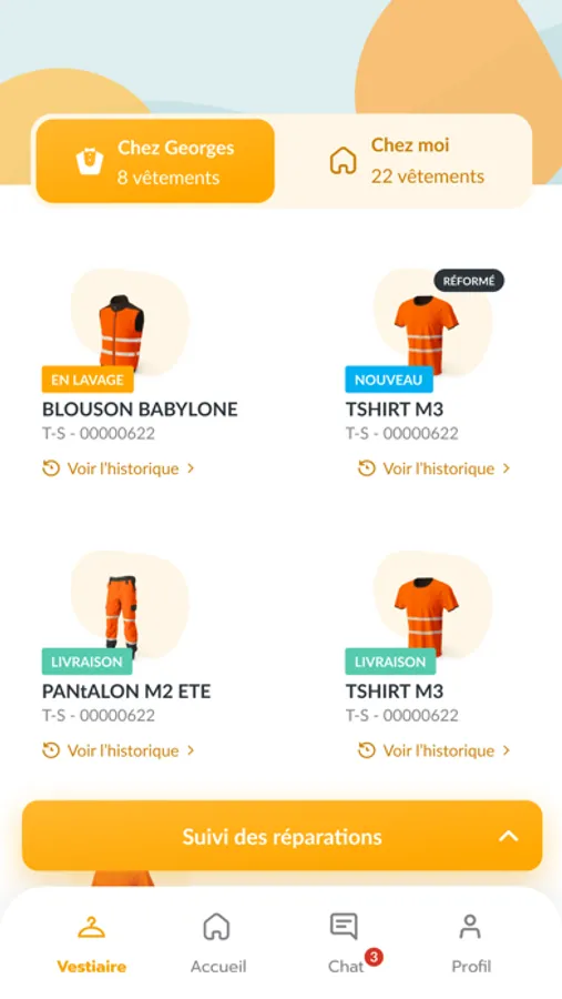 Grâce à cette application, vous pouvez suivre en temps réel les étapes d’entretien de vos vêtements professionnels et EPI. Georges, votre majordome digital, vous indique par exemple son jour de passage sur votre point de livraison, les tenues en cours de lavage, celles en cours de réparation, celles en attente de livraison et celles livrées dans votre vestiaire. Vous êtes également informé quand l’un de vos EPI est reformé.