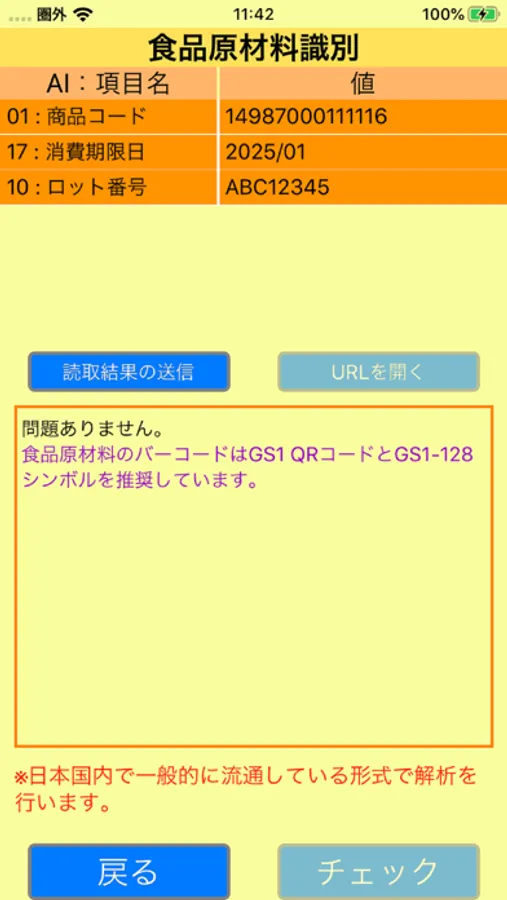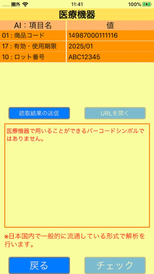 このアプリは、GS1アプリケーション識別子(AI)を表現できる各種バーコードが、国内のヘルスケア業界のルールや、食品原材料ガイドラインに沿ったデータかどうかを簡易チェックできます。