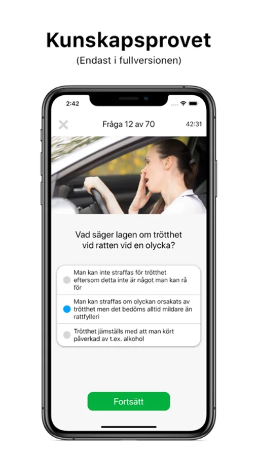 Maximize your chances of passing the theory test by practicing similar questions in the same format. Körkortsfrågor makes studying driver's license theory becomes easier and more fun.