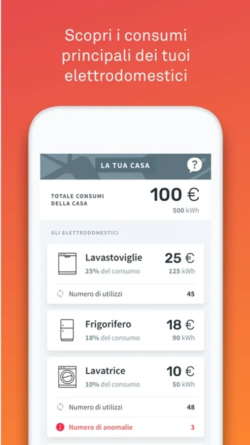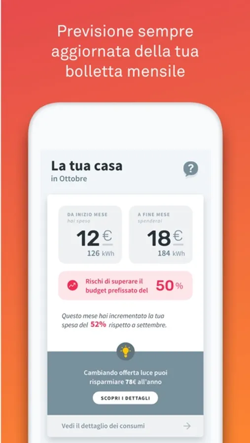 Nella sezione Casa troverai una previsione sempre aggiornata della tua bolletta mensile, che ti permetterà di scoprire se i tuoi consumi cambiano nel tempo, di conoscere gli elettrodomestici che consumano di più e consigli personalizzati di risparmio.