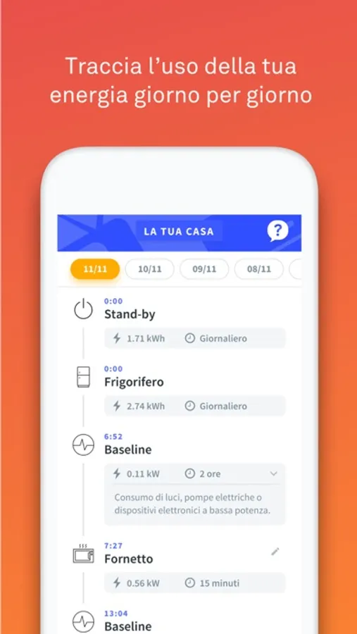Nella pagina Storico della sezione Consumi potrai accedere ad una timeline personalizzata dedicata agli elettrodomestici che hai utilizzato nel corso della giornata scoprendo così per quanto tempo sono rimasti accesi.