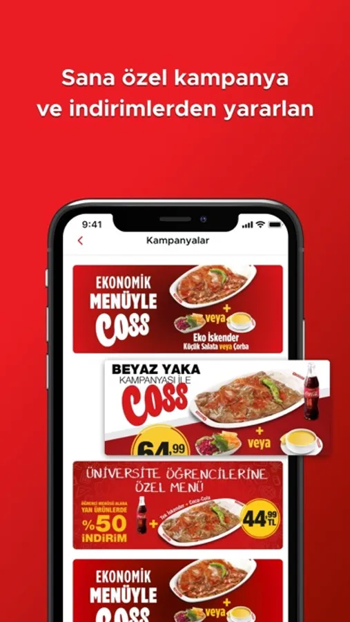 • Baydöner Cossla mobil uygulamasında birbirinden lezzetli İskender çeşitleri, çorba, salata, patates kızartması, tatlılar ve sürekli yenilenen COSS fırsatlar sizleri bekliyor.