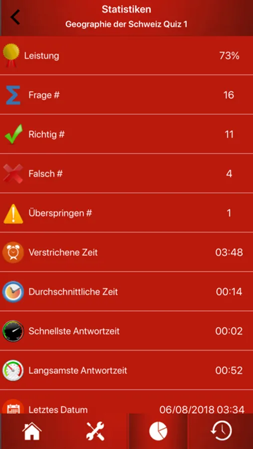 - Der Bildschirm "Quiz - Leistungsverlauf" zeigt nur gespielte Quiz an. Sie können das Datum des zuletzt gespielten quiz und die letzten Erfolge für gespielte Quiz anzeigen.