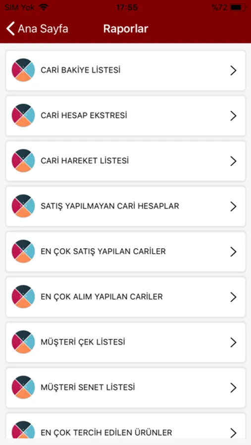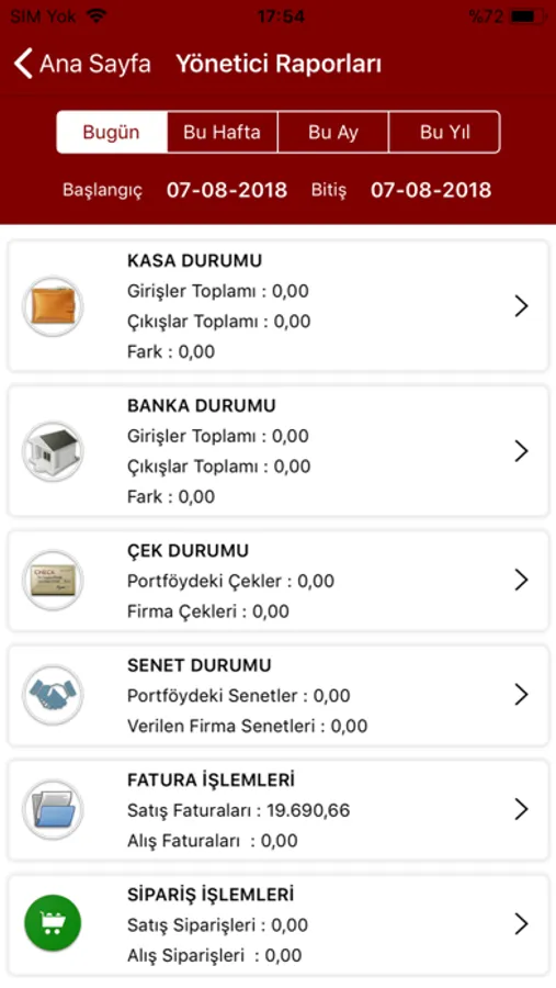 Yöneticiye ait özel rapor ekranında hızlı bir şekilde fatura , sipariş , kasa , banka , çek/senet durum raporlarına ulaşılabilir.