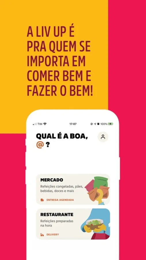 Em parceria com agricultores familiares, levamos ingredientes fresquinhos direto de quem planta para a nossa cozinha e para a sua mesa. Baixando o app da Liv Up, você fortalece a agricultura familiar e orgânica, causando impacto positivo de ponta a ponta. E olha que demais: é possível pagar com vale-refeição, vale-alimentação, cartão de crédito e boleto.