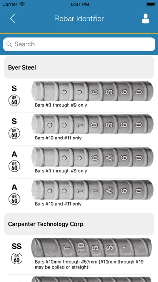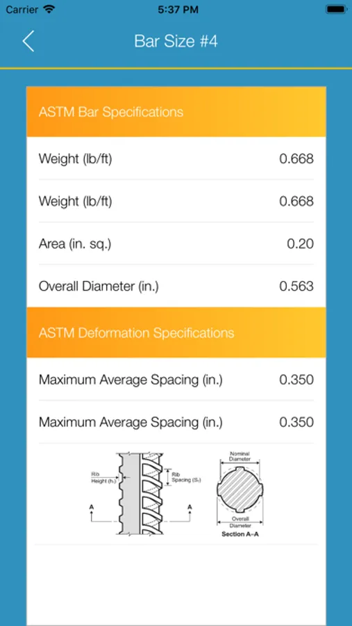 The app provides standard rebar specifications including sizes, diameters, areas and weights along with 90-, 135- and 180-degree hook details. Minimum yield and minimum tensile requirements per ASTM are also included. Industry standard bar markings for inch-pound rebar is illustrated for grades 40, 50, 60, 75, 80, 100 (A615), 100 (A1035), and 120.
