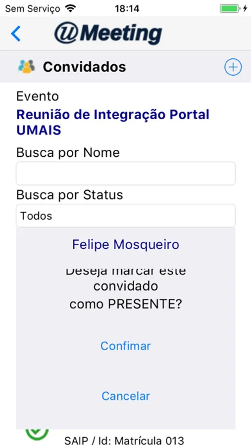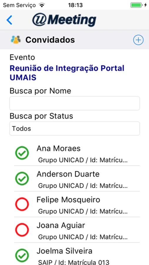 Possibilidade de editar os convidados do evento, na forma de lista de presença, guardando a data e hora de presença de cada pessoa que compareceu, fornecendo informações de quem foi ou quem não foi.