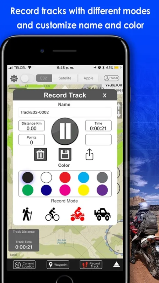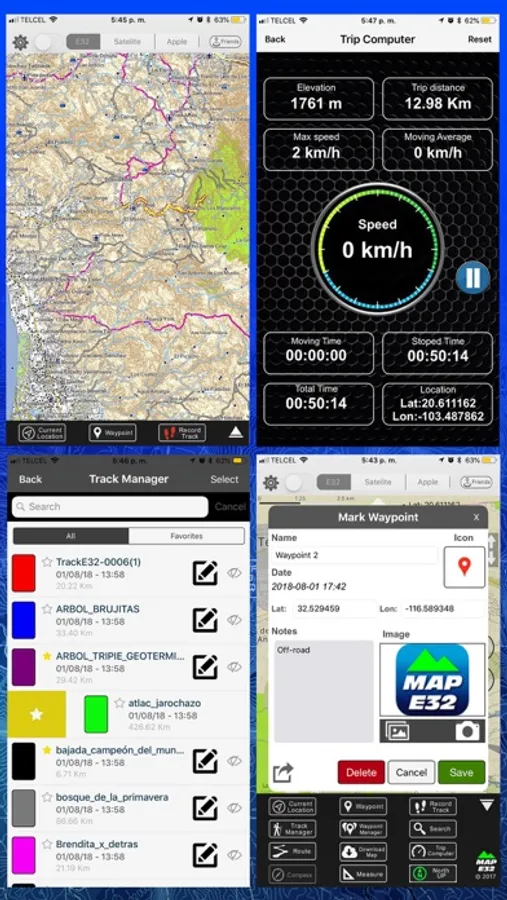 Record tracks, mark waypoints, track manager, waypoint manager, create a group of FRIENDS and track in real time your friends position and their track, search places, create Routes, Download map regions for offline use, trip computer, compass , Measure multi-point distance, switch between Map E32 - satellite images - apple maps, create backups, share and import GPX files, and many more functions designed to fit your needs when you are out in the adventure.