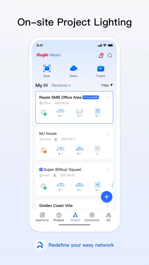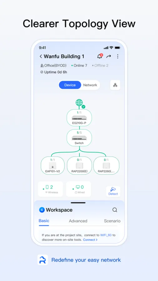 Ruijie Cloud is a powerful tool that allows you to quickly deploy your wireless network in only 1 minute by scanning the QR code on devices. You can easily add devices, set WiFi and monitor the network status, topology and alarm.