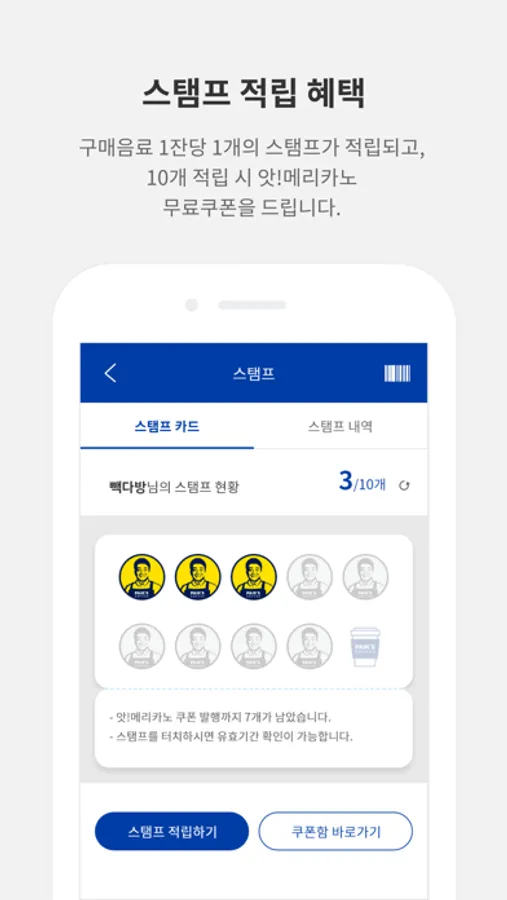 - 스탬프 : 음료 1잔당 1개의 스탬프가 적립되며, 10개 적립 시 앗!메리카노 무료쿠폰을 드립니다. 스탬프 적립내역 및 유효기간을 확인할 수 있습니다.